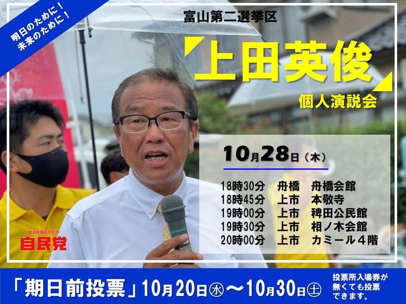【上田英俊個人演説会 in 舟橋・上市】 皆様是非お越しくださいませ!