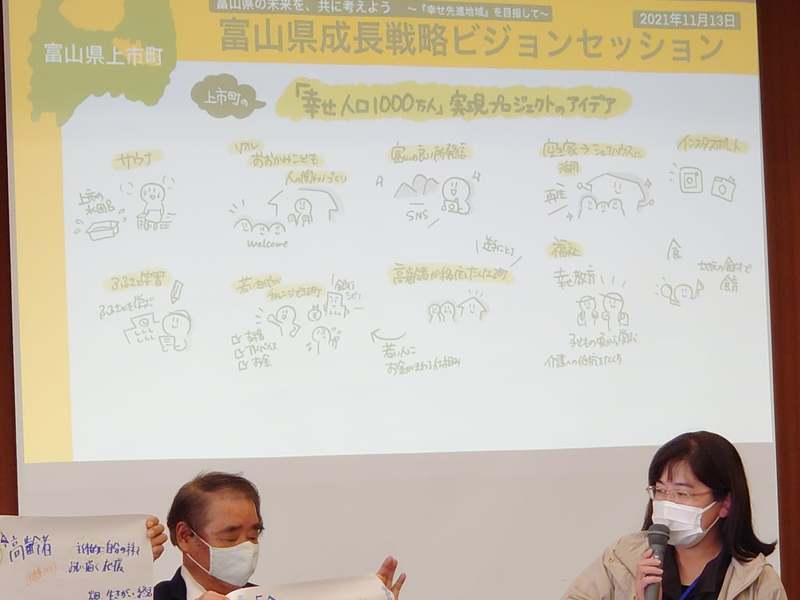 まず新田知事から「Well being」など成長戦略の説明があり、コンサル会社のファシリテーターの誘導によって、知事の説明で心に残った言葉を選び出し、上市町活性化策の議論につなげていきました。