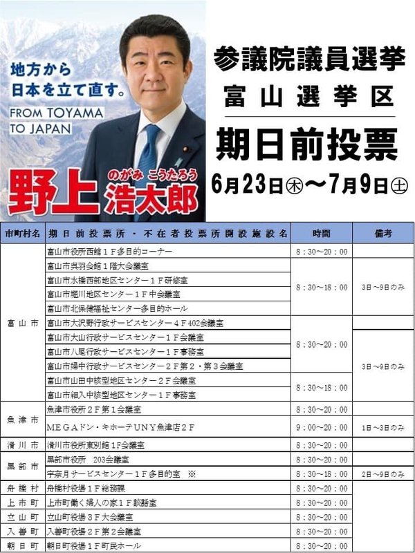 ホーム>政党・政治家>山崎 むねよし (ヤマザキ ムネヨシ)>【期日前投票へ】皆さんの思いを投票してください。