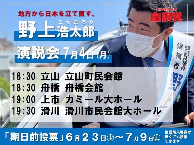 明日7月4日は、舟橋・上市・立山・滑川で個人演説会です!