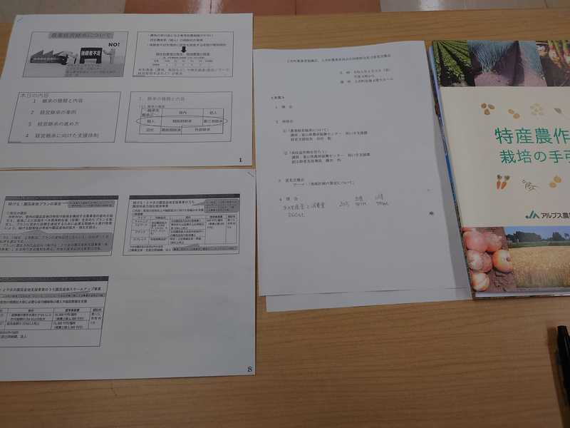 富山県農業振興センター担い手支援課の田村班長さん、藤井指導員さんによる、経営継承と高収益作物導入の講演を伺いました。