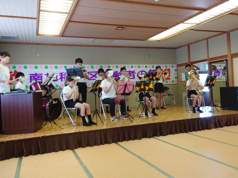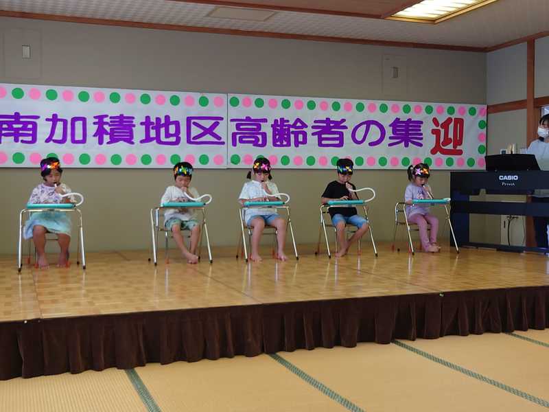 【南加積地区高齢者の集い】 新しいエアコンが効いた涼しい公民館で、元気一杯の高齢者の集いです! 子供たちの一生懸命な姿に元気づけられます♪ みんなでかき氷たべた~い!