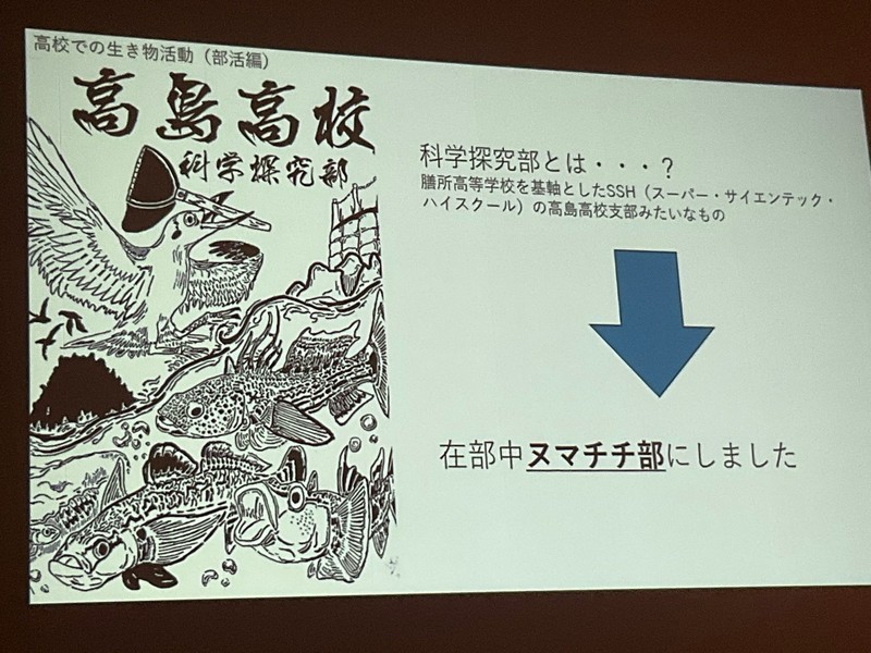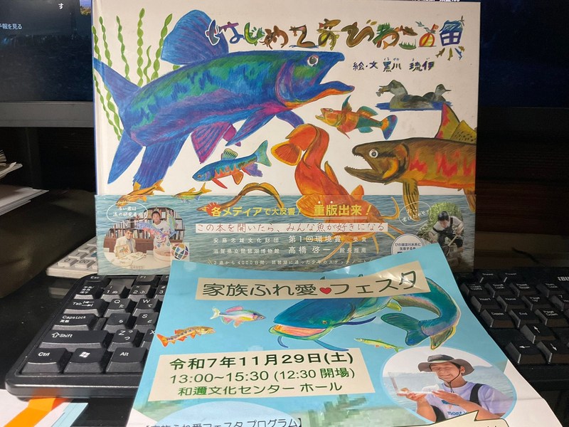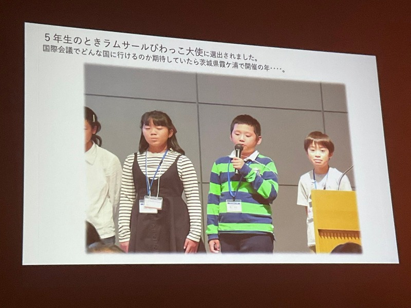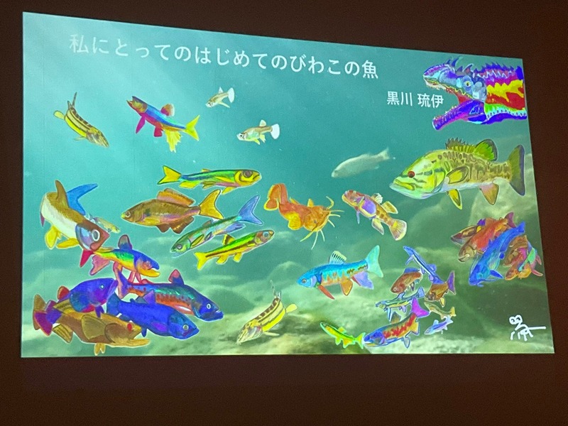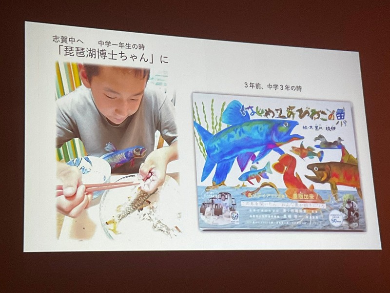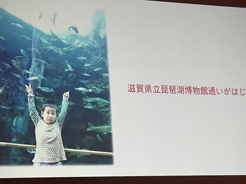 魚以外には、鳥ではウミアイサ、ニホンヒメフナムシ、ハマガニ、など琵琶湖の研究者でもほとんど関心をむけない生物も紹介。そして後半にはいろんな生き物とふれあう幼少期からの紹介で、2歳の時に琵琶湖博物館に出会い、それから毎日まいにち、琵琶湖博物館に足を運んでくれて、4000日とか?1年365日しかないので、何年間、通い続けたのでしょう!小学校5年の時には滋賀県の「ラムサールびわっこ大使」に応募して霞が浦の世界湖沼会議で発表をしたという。今年の「大阪・関西万博」では7月24日の滋賀デイに、宮川大輔さんなどに交じって琵琶湖の魅力を語ってくれました。