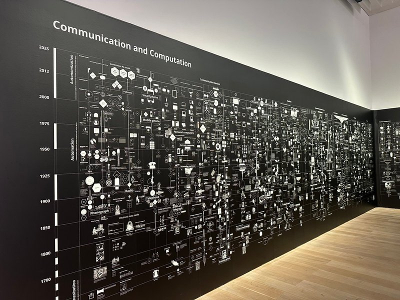 一方で、シンプルなビデオゲームが席巻していたり、クライマックスにお見舞いされた私と同年代のアーティスト、ケイト・クロフォード&ヴラダン・ヨレル両氏の大作『帝国の計算:テクノロジーと権力の系譜 1500年以降』にかかる解説『この長大な時間軸を図解した本作は、テクノロジーについて考える際に、深い歴史的、政治的、経済的な文脈を考えず、最新のスペクタクルやデバイスにまつわる議論ばかりに終始し、短期的な視点に囚われている現状を正す試みと言えるでしょう。』に衝撃を受けたりと、前衛感ばかりではない示唆に富む展覧会でした。