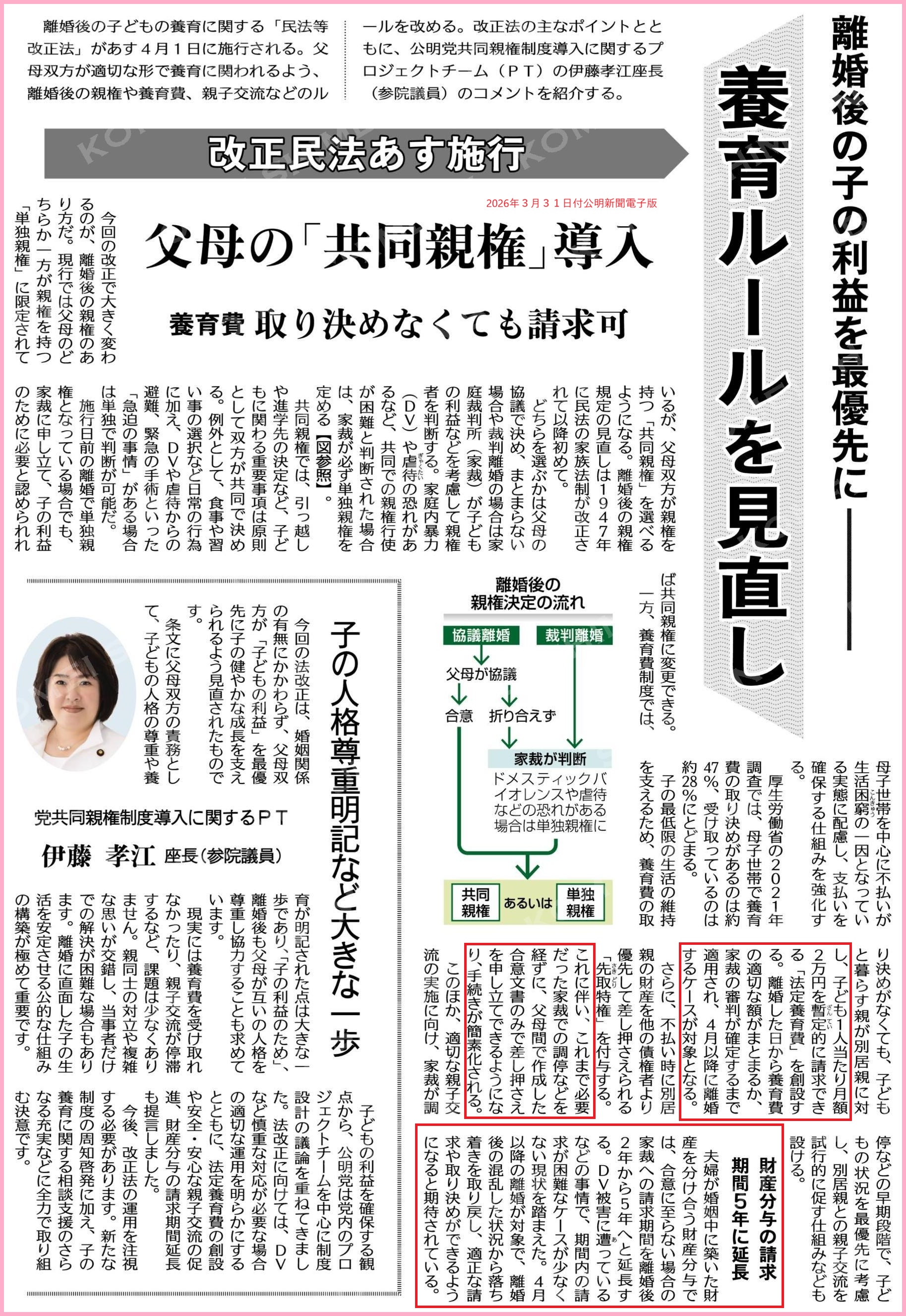 養育費を巡る実態を踏まえ、公明党PTの長年の推進もあり、4月1日より民法改正で、公的書面が無くても、