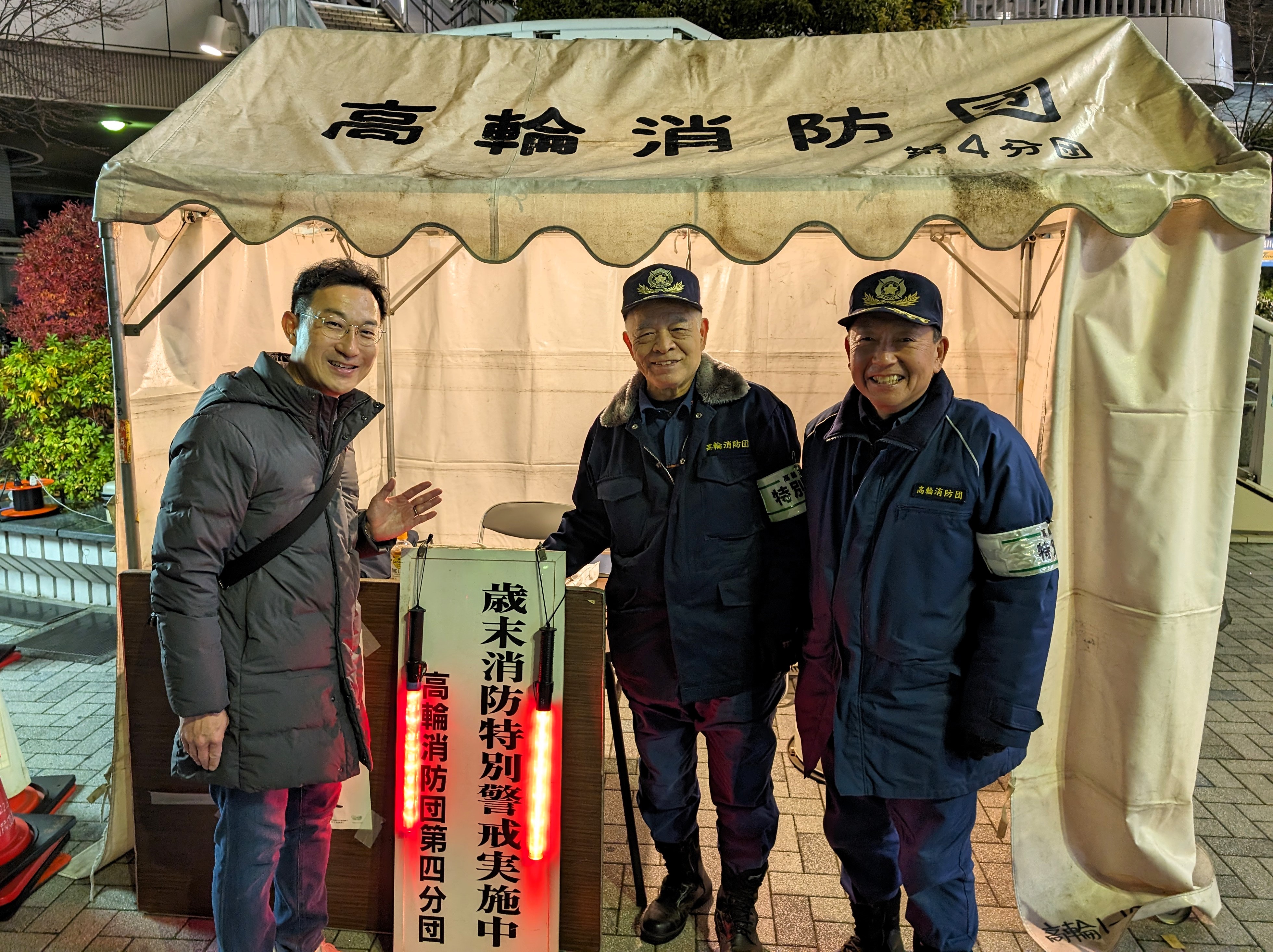 品川駅港南口で歳末警戒中の 港区 高輪消防団第4分団の方々に、一年間の御礼を🚒