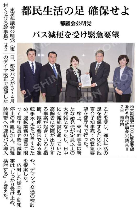 東京都議会公明党(東村くにひろ幹事長)は2日、都営バスが3~4月のダイヤ改正で減便したことを受け、都民生活の足を確保するための小池百合子知事宛ての緊急要望を都庁内で行った。