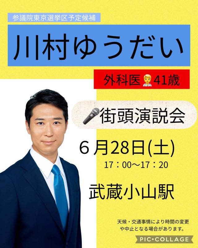 ホーム>政党・政治家>新妻 さえ子 (ニイヅマ サエコ)>【街頭演説会のお知らせ📣】東京選挙区予定候補 #川村ゆうだいが、品川区で初めて街頭演説を行いま...
