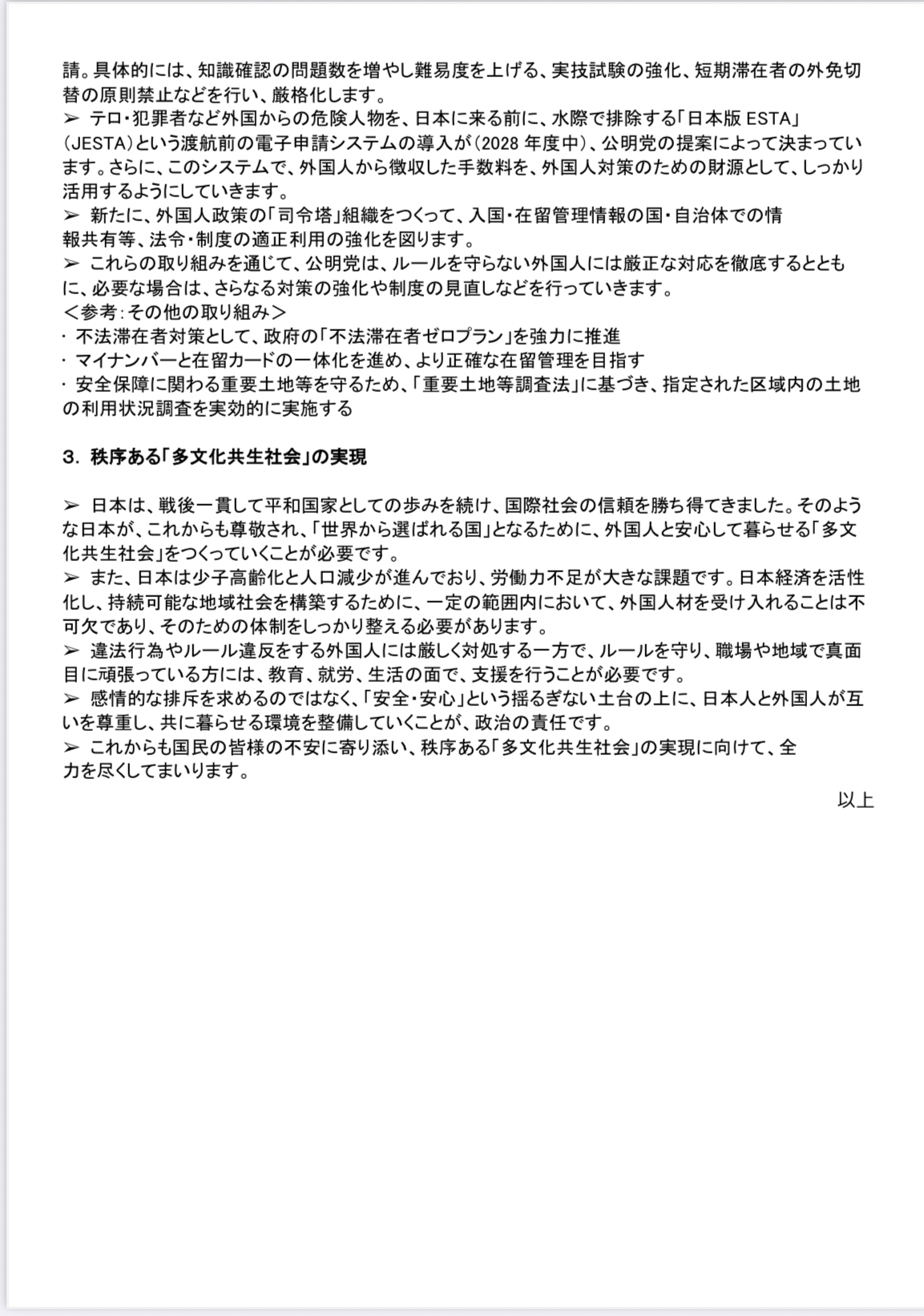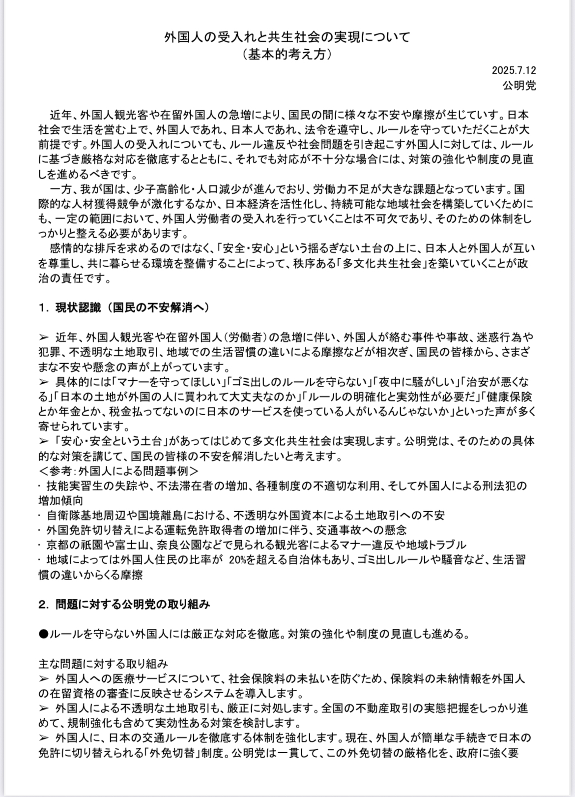 感情的な排斥を求めるのではなく、「安全・安心」という揺るぎない土台の上に、日本人と外国人が互いを尊重し、共に暮らせる環境を整備することによって、秩序ある「多文化共生社会」を築いていくことが政治の責任です。