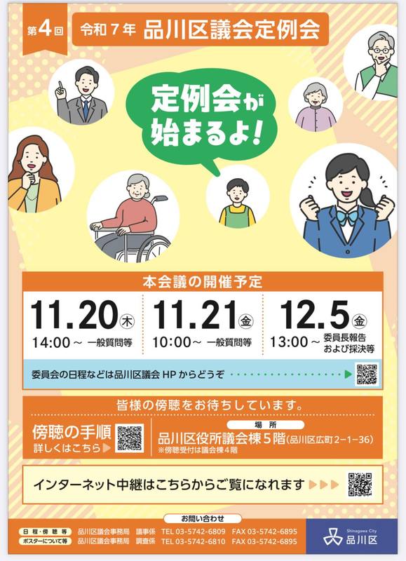 令和7年品川区議会第4回定例会は11月20日から12月5日までの16日間の会期で開催されます。