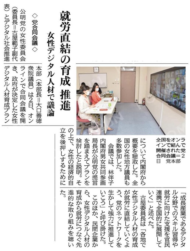 ホーム>政党・政治家>新妻 さえ子 (ニイヅマ サエコ)>【女性デジタル人材育成プラン】本日の公明新聞に掲載された、オンライン会議に参加させていただきました。