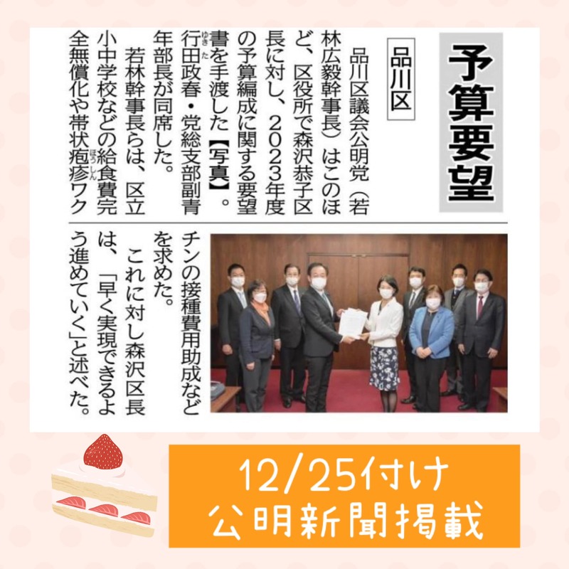 若林幹事長らは、区立小中学校などの給食費完全無償化や帯状疱疹ワクチンの接種費用助成などを求めた。