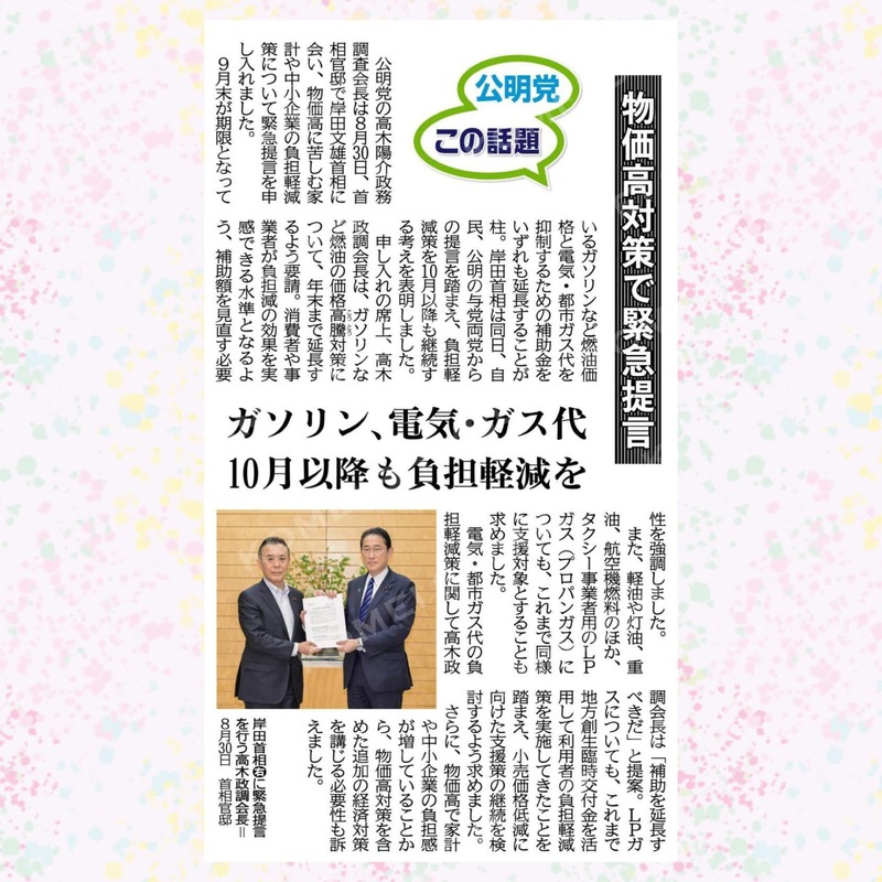 ホーム>政党・政治家>新妻 さえ子 (ニイヅマ サエコ)>【電気代💡ガス代】公明党の山口代表は、政府が負担軽減策として実施している電気・ガス料金の補助に...
