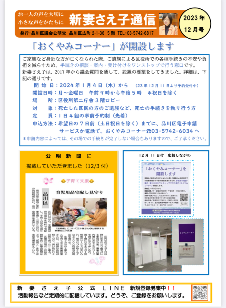 いよいよ、《おくやみコーナー》が、24年1月4日から区役所内に開設します🖊️予約も始まりました。年始の予約は、1月4日からになります。