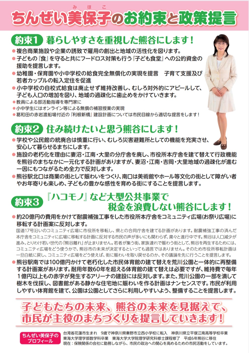 以上。ちんぜい美保子は、子どもたちの未来、熊谷の未来を見据えて、市民が主役のまちづくりを提言していきます!