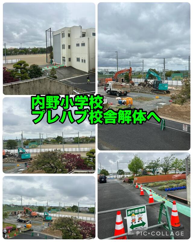 児童数の増加に伴い活用してきた内野小学校のプレハブ校舎につきまして、このたび児童数の推移が落ち着いてきたことを受け、昨年度末より解体工事が進められており、5月中の完了が予定されています。