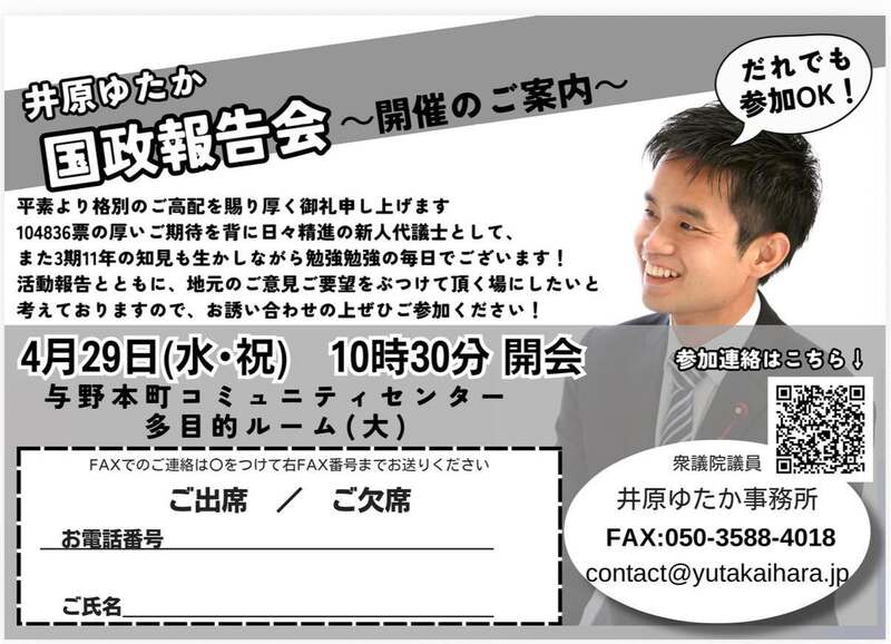 ホーム>政党・政治家>井原 ゆたか (イハラ ユタカ)>4/29水祝10時半〜与野本町コミセンにおいて国政報告会(中央区)を行います!ご興味のある方は...