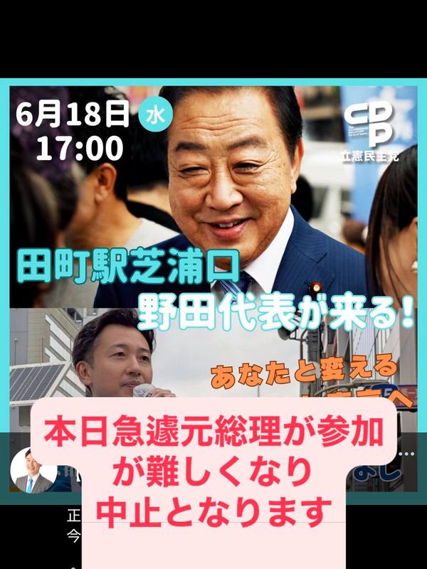 ホーム>政党・政治家>山野井 つよし (ヤマノイ ツヨシ)>【緊急のお知らせ】本日予定しておりました演説会につきまして、ご案内しておりました野田佳彦元総理...
