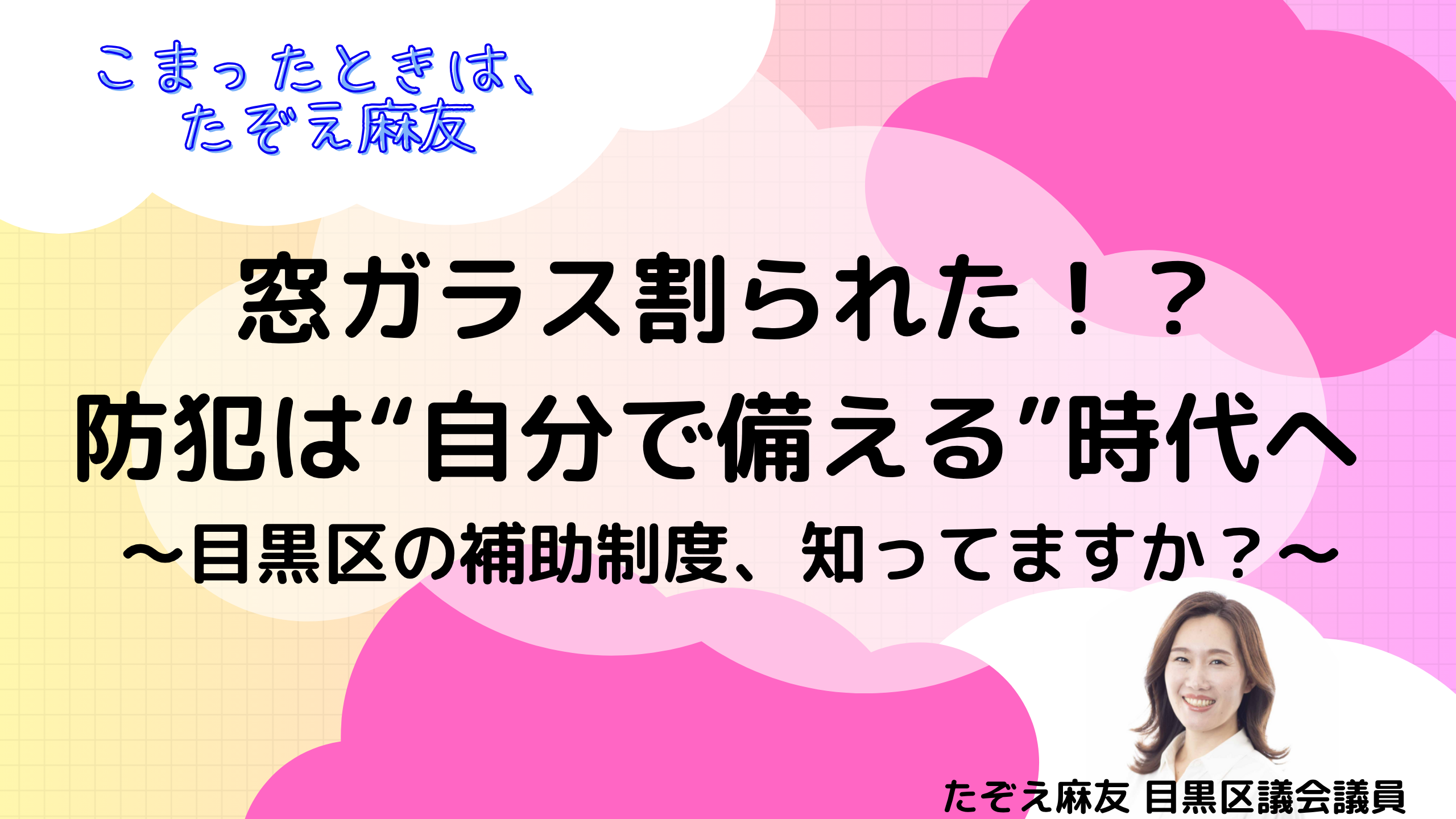 ホーム>政党・政治家>たぞえ 麻友 (タゾエ マユ)>【窓ガラス割られた!?】防犯は“自分で備える”時代へ 〜目黒区の補助制度、知ってますか?〜