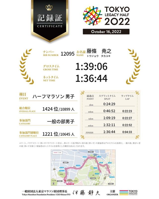 ホーム>政党・政治家>藤條 たかゆき (トウジョウ タカユキ)>【#東京レガシーハーフマラソン2022】記録証が届いたのでメモ✏︎東京マラソンみたいに、来年か...