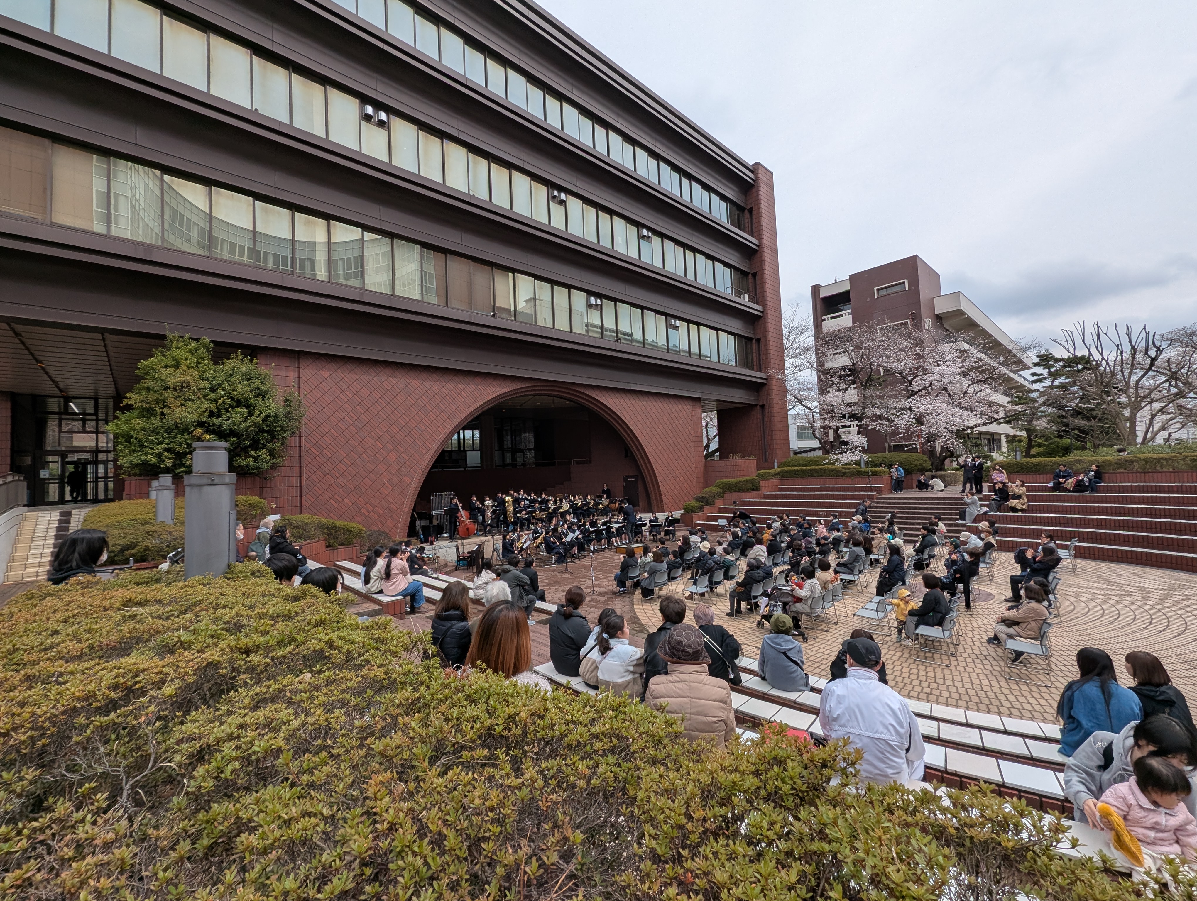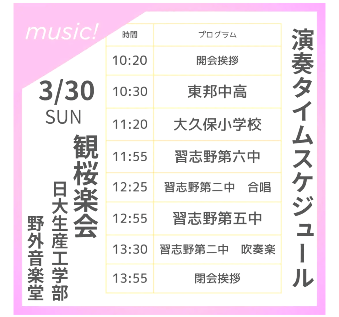 大学構内の野外音楽堂を第1会場とし、東邦大学付属東邦中学校高等学校 、習志野市立第二、第五、第六中学校、大久保小学校による吹奏楽の演奏を聴きながら桜を楽しむ趣向。