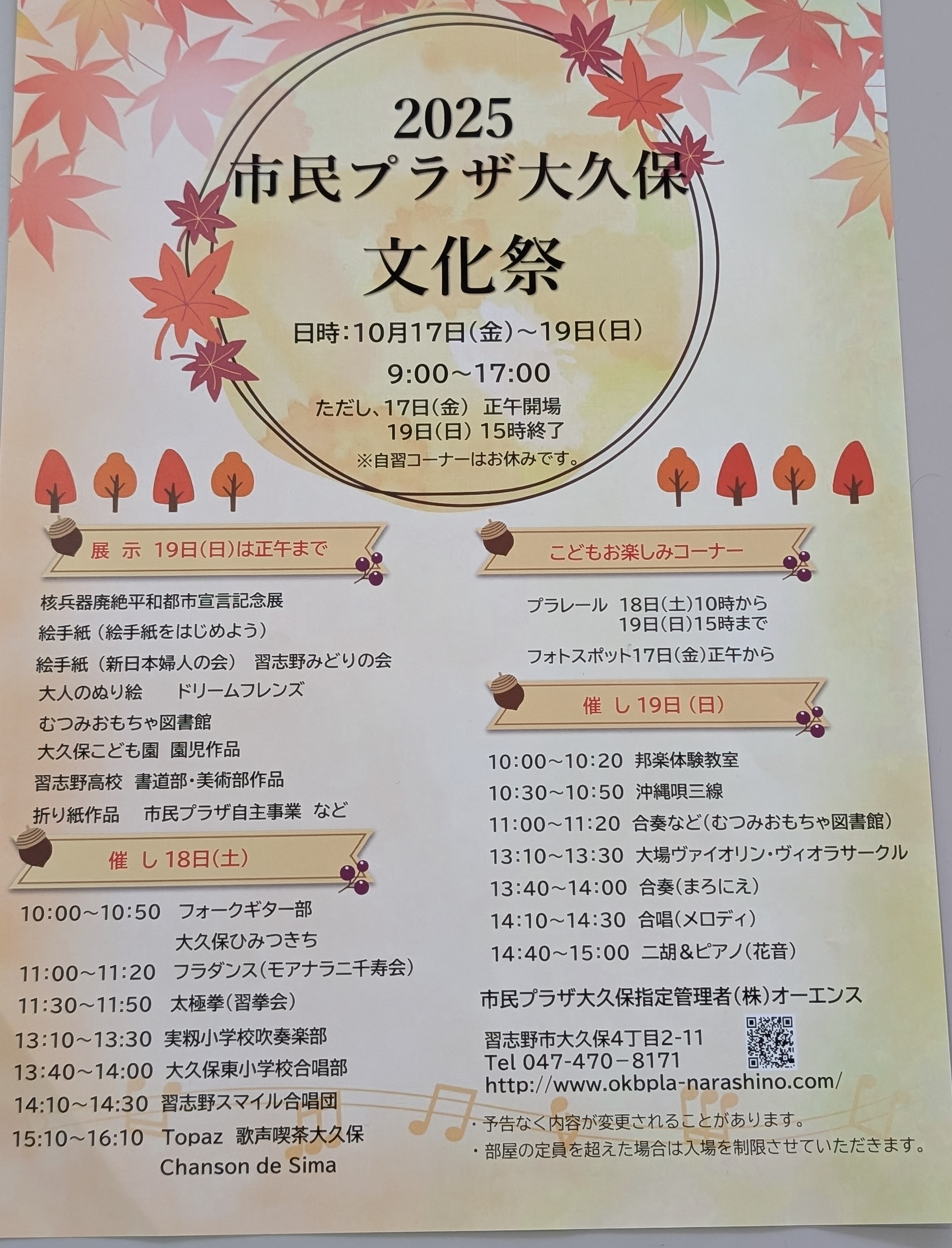 各地で文化祭が開催です。10月17日から19日まで市民プラザ大久保にて文化祭が開催されています。