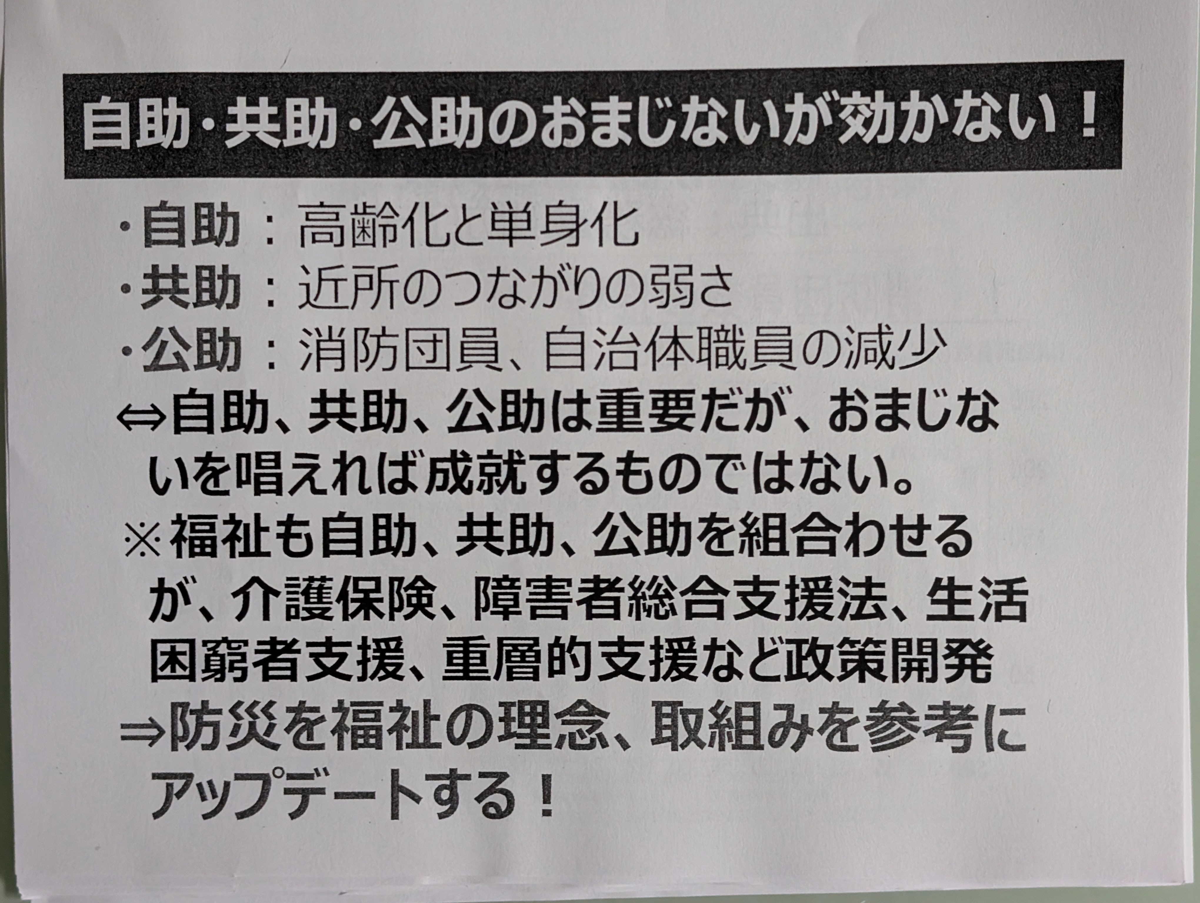 これまでの「自助・共助・公助」という枠組みだけでは、社会の多様化や地域の人間関係の変化に十分対応できなくなっている。 だからこそ、防災を福祉の理念、取組を参考にアップデートしていく必要があるとの指摘。