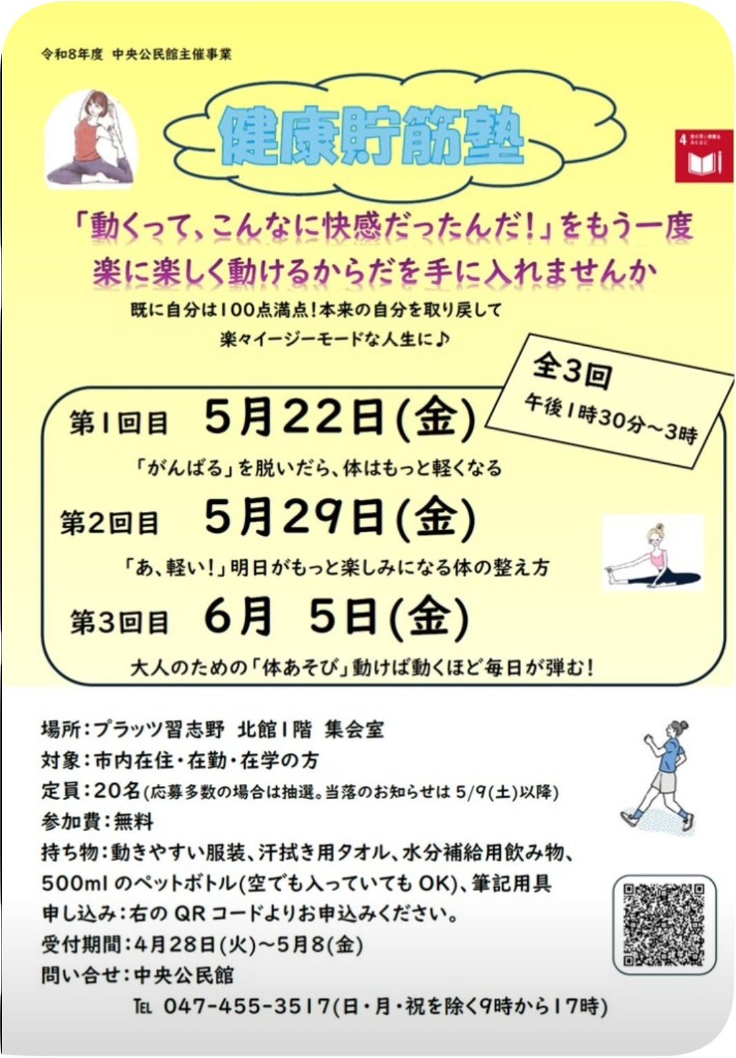 中央公民館で、「健康貯筋塾」が開催されます。今回の講座のテーマは、「健康貯筋」。日々の生活の中で、「以前より体が重く感じる」「もっと楽に体を動かしたい」という皆さん、 無理なく、楽しく体を動かすコツを学べる内容となっています。運動が久しぶりという方も参加してみてはどうでしょう。