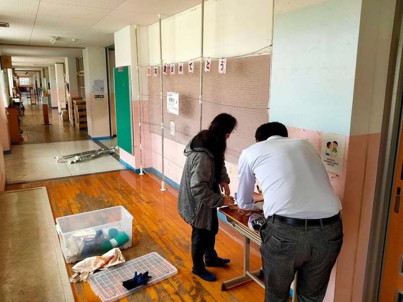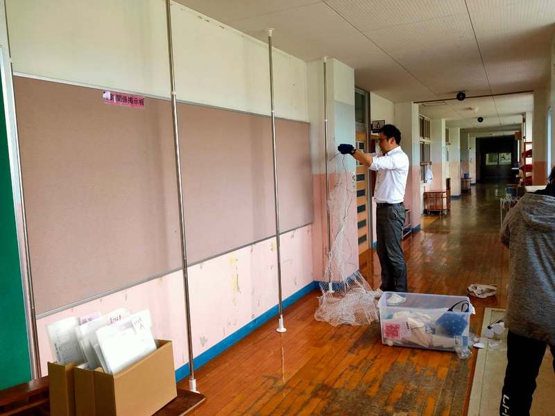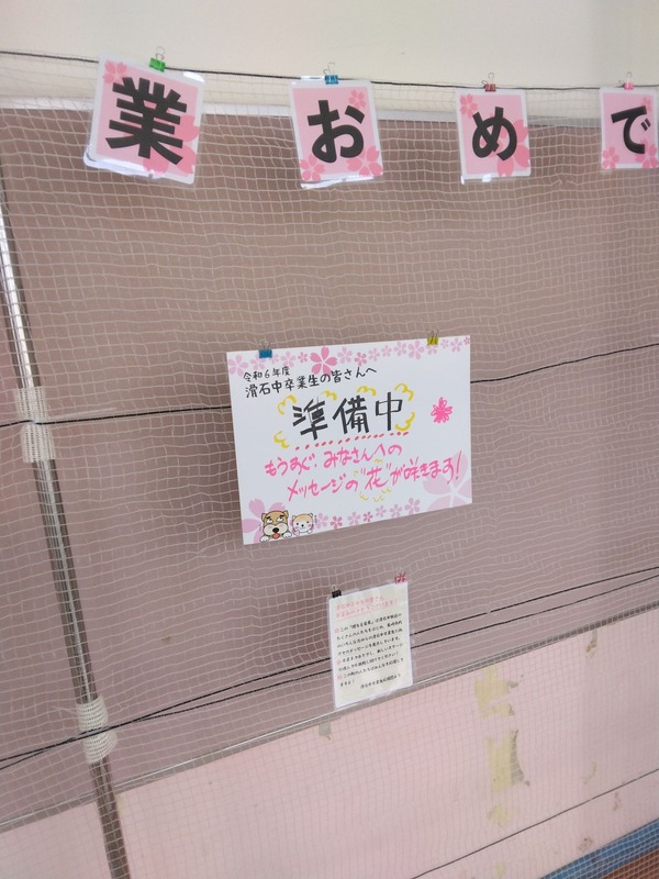🔵滑石中の卒業生に、地域みんなからお祝いメッセージを伝える校内展示会「贈る言葉展」。今日は廊下に展示するための土台設置作業。