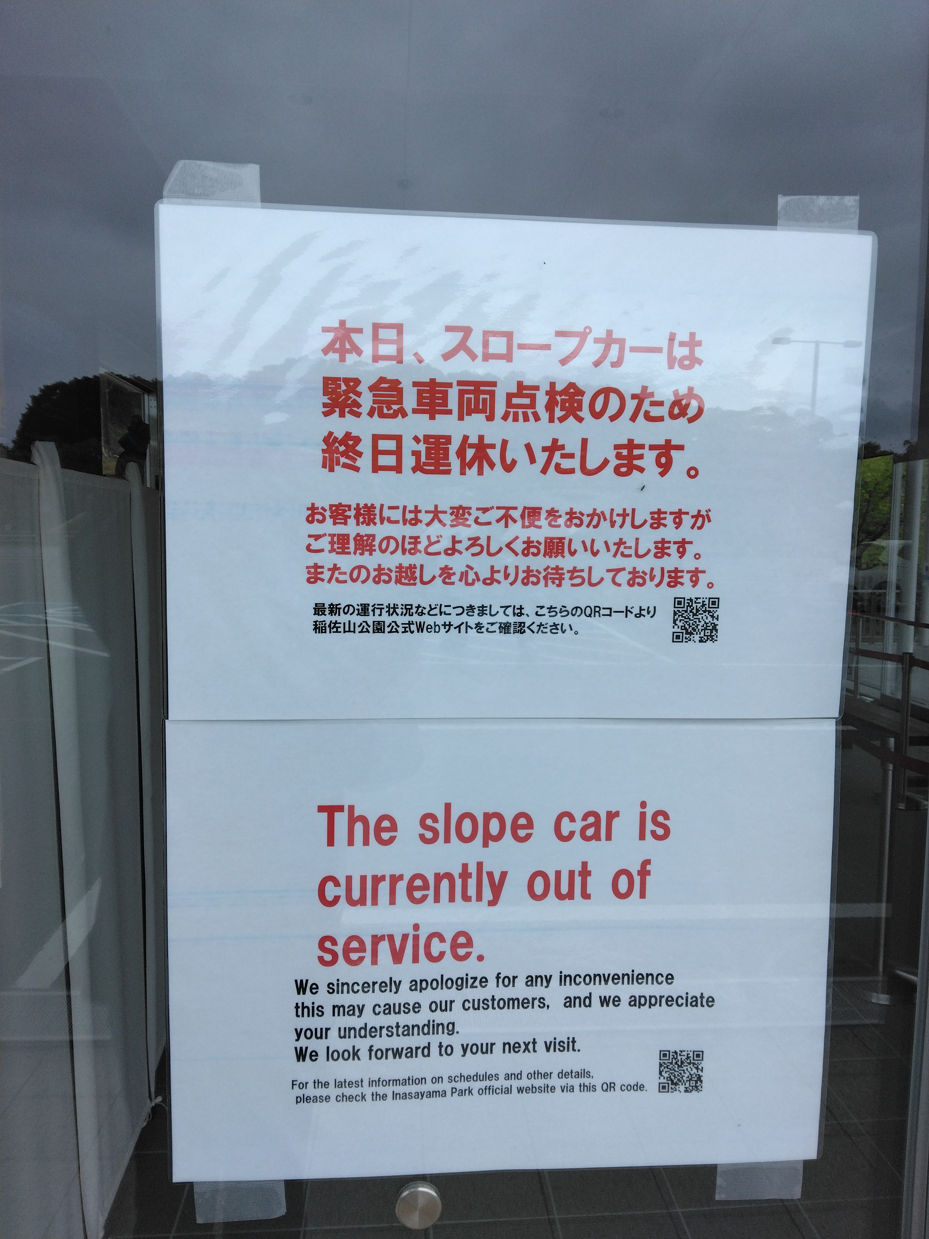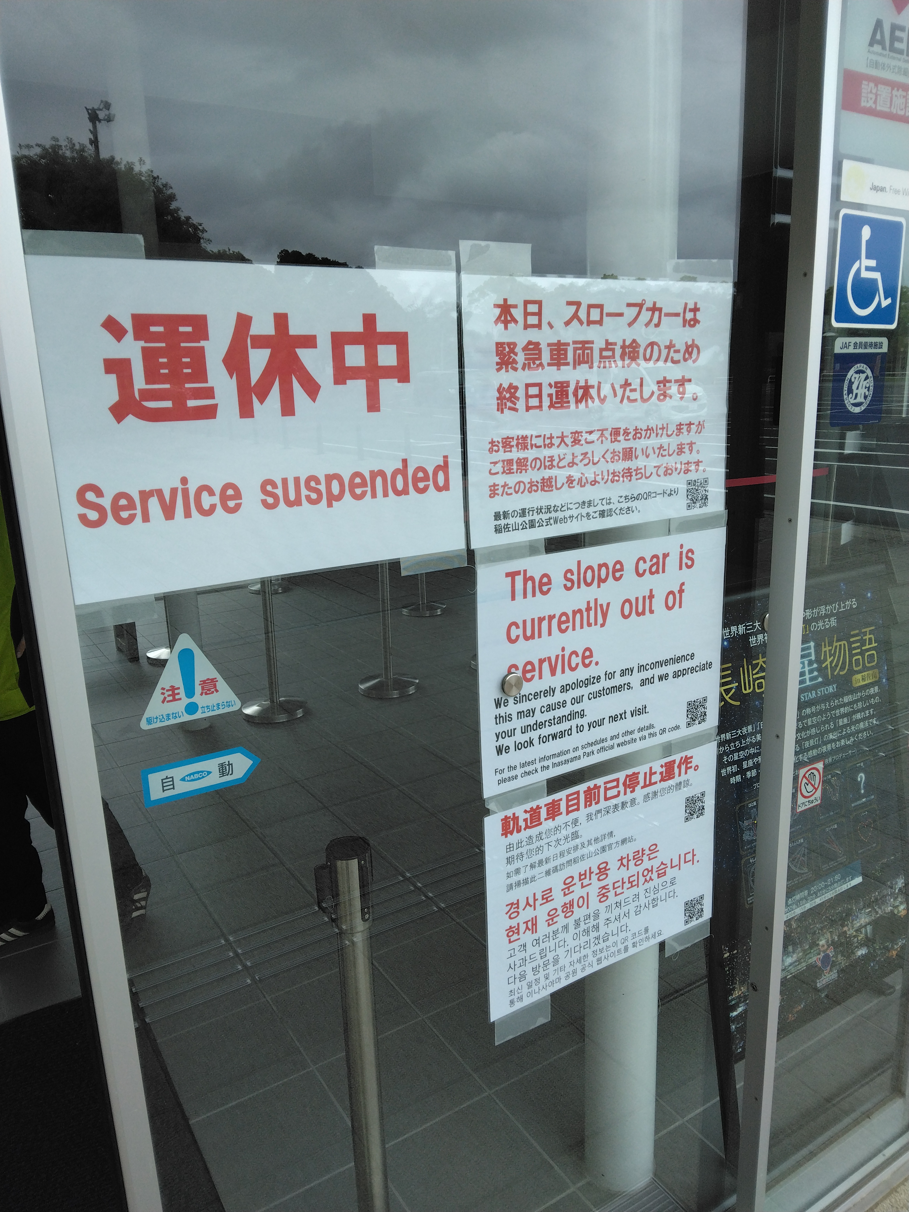 🔵明日月曜になると、長崎市の担当所管も対応に動き出すと思うが、来訪者が多い週末対応がまったくないというのがあまりにも緊張感がなく残念…。聞けば“運休”を知らせる中腹駅やバス停付近の看板は運営委託スタッフ手作り。