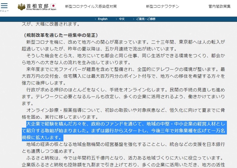 あるとすれば、菅総理が施政方針演説でも言っていました、地域中小企業に大企業(銀行)の人材紹介制度。