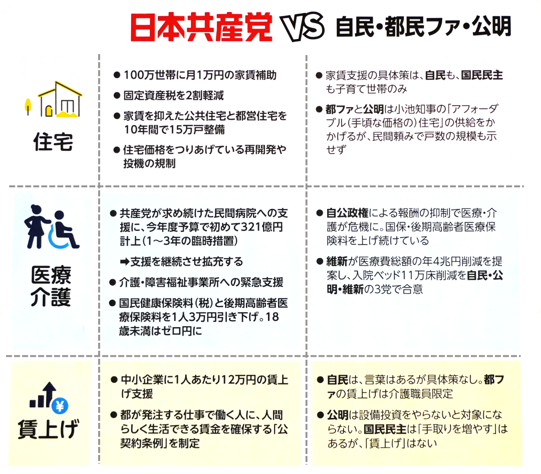 都政の3つの重要課題(①賃上げ、②医療・介護、③住宅)で、私たち日本共産党と、知事与党(自民・公明・都民ファ)を比べてみました。