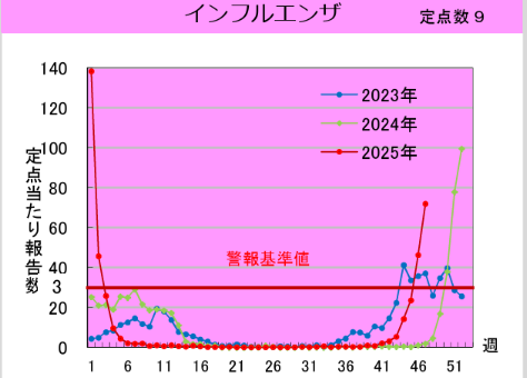 一宮市におけるインフルエンザ感染症者数は、11月17日(月)~11月23日(日)において、定点あたりの報告者数は71.89人(前週比:55.5%増)となり、5週連続で増加しました。