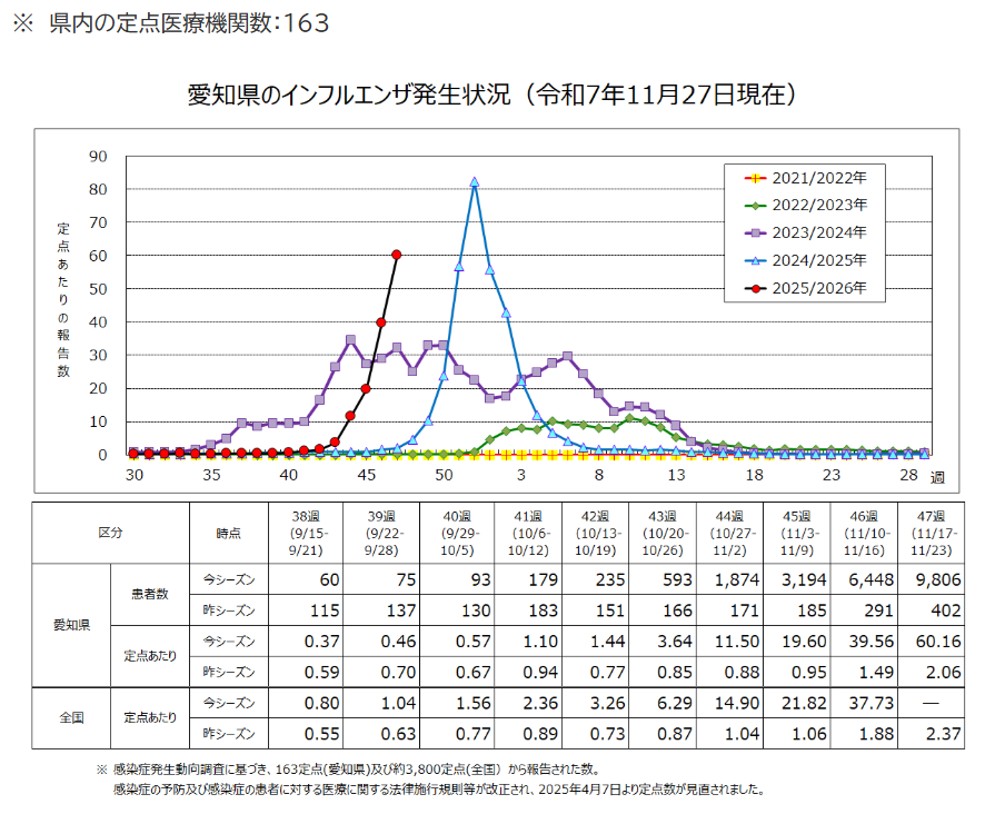警報の指標である「30」を上回ていることから、11月20日(木に、愛知県内全域にインフルエンザ警報が発令されました。