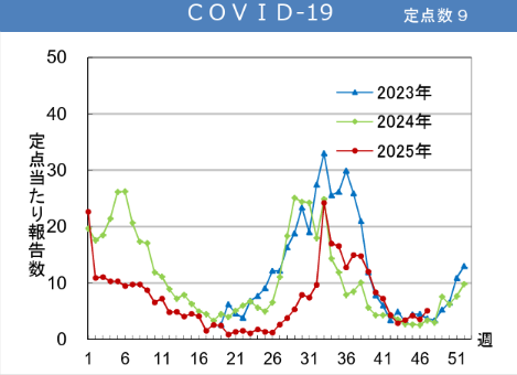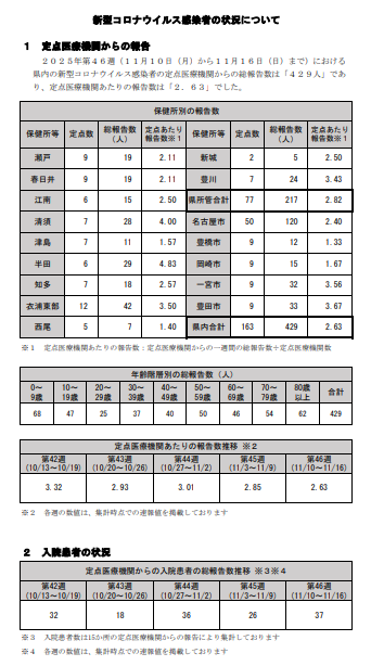 新型コロナ(COVID-19)については、令和7年11月17日(月)~11月23日(日)における一宮市保健所管内の感染症者数は、定点あたりの報告者数は5.11人(前週比:43.5%増)となり、2週ぶりに増加しました。