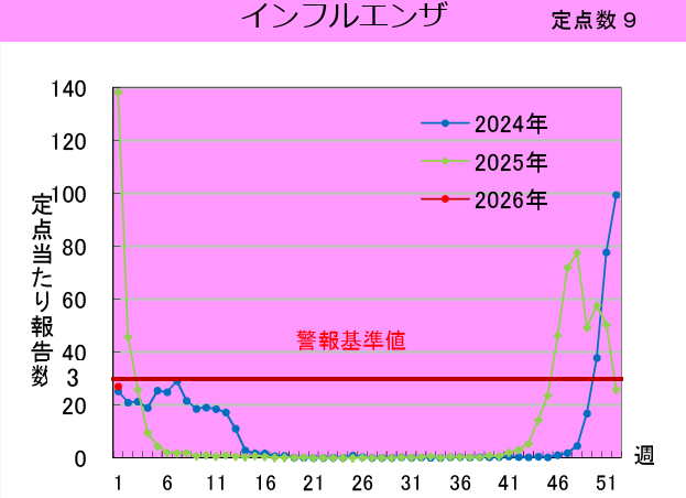 一宮市におけるインフルエンザ感染症者数は、12月19日(月)~1月4日(日)において、定点あたりの報告者数は27.00人(前週比:4.7%増)となり、昨年末は減少しましたが、再び増加になりました。