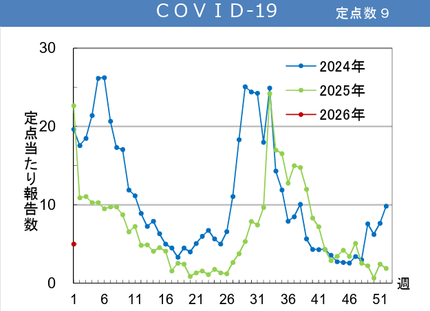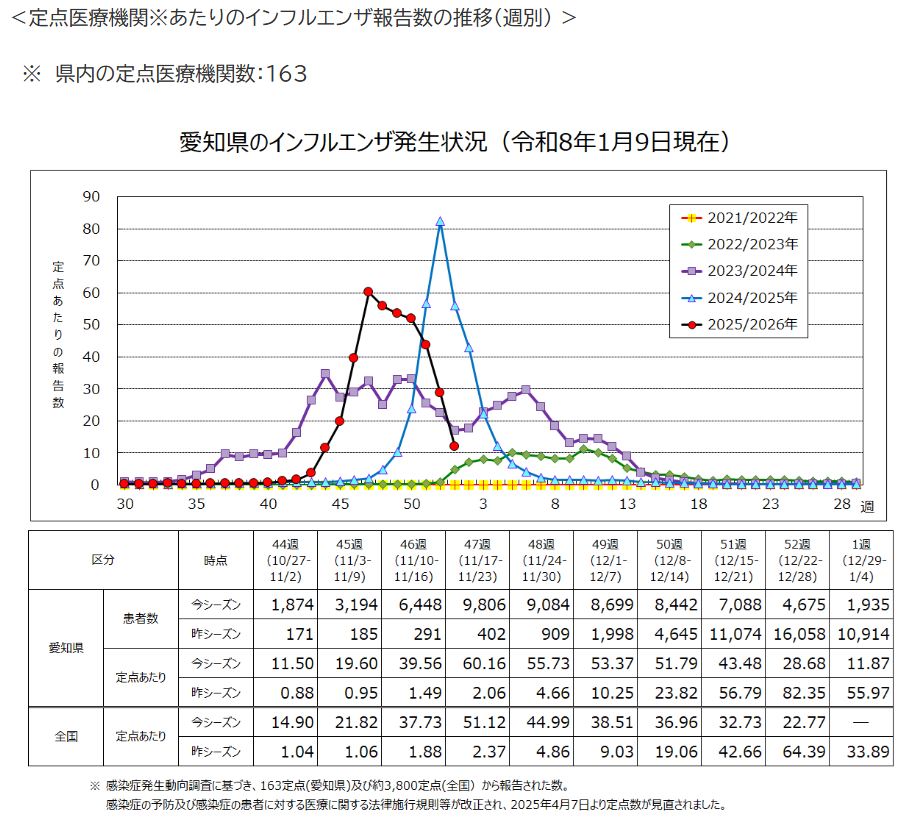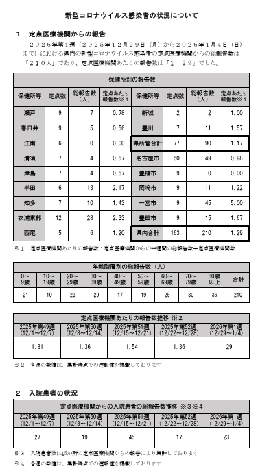 新型コロナ(COVID-19)については、令和7年12月29日(月)~1月4日(日)における一宮市保健所管内の感染症者数は、定点あたりの報告者数は5.00人(前週比:165%増)となり、昨年末は減少しましたが、再び増加になりました。