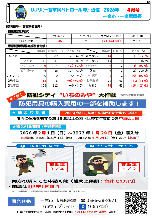 一宮市は、一宮警察署とともに、I.C.P.O(一宮市民パトロール隊)通信2026年4号を発行しました。