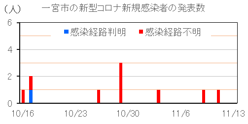 11月13日(土)、一宮市における新型コロナ新規感染者としての発表はありませんでした。(前週同曜日比:±0人)