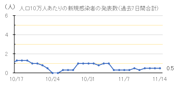 過去7日間平均の1日あたりの新規感染者発表数は0.3人(前週同曜日比:+0.1人)になりました。人口10万人あたりの新規感染者数(過去7日間合計)は、0.5人(前週同曜日比:+0.3人)となりました。