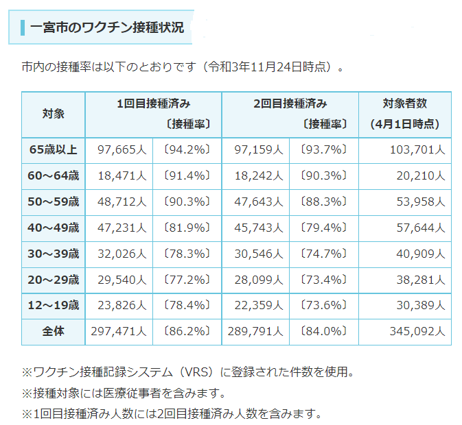 一宮市は、11月24日(水)時点の一宮市のワクチン接種状況を発表しました。接種対象の全年齢について、1回目接種済みは86.2%、2回目接種済みは84.0%でありました。