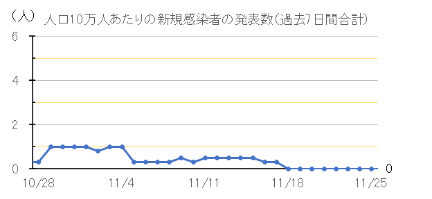過去7日間平均の1日あたりの新規感染者発表数は0人(前週同曜日比:±0人)になりました。人口10万人あたりの新規感染者数(過去7日間合計)は、0人(前週同曜日比:±0人)となり、8日連続の0人にもなりました。