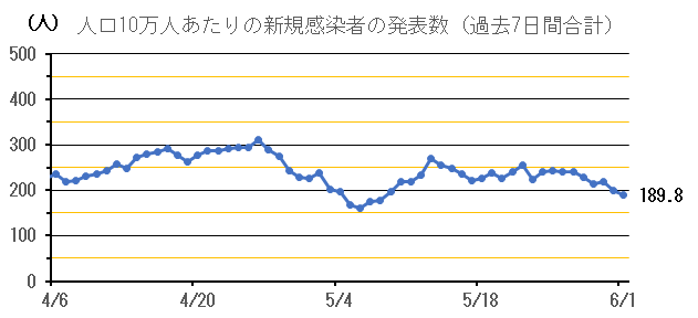 人口10万人あたりの新規感染者数(過去7日間合計)は189.8人(前週同曜日比-54.0人)となりました。