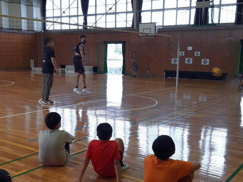 近裕崇選手のサーブを子ども達がレシーブしたり、スパイクを間近で見たりしました。