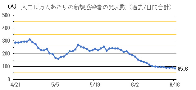 人口10万人あたりの新規感染者数(過去7日間合計)は85.6人(前週同曜日比-13.6人)となりました。