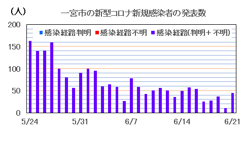一宮市は、6月21日(火)、新型コロナ新規感染者として45人(前週同曜日比:-4人)を発表しました。