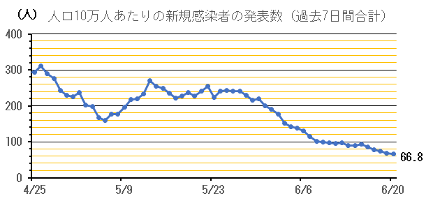 人口10万人あたりの新規感染者数(過去7日間合計)は66.8人(前週同曜日比-23.0人)となりました。