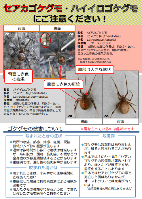 また、ハイイロゴケグモを見つけても、素手で捕まえたり、さわらないようにして下さい。発見した場合は、発見した奈暑がある自治体にご連絡下さい.