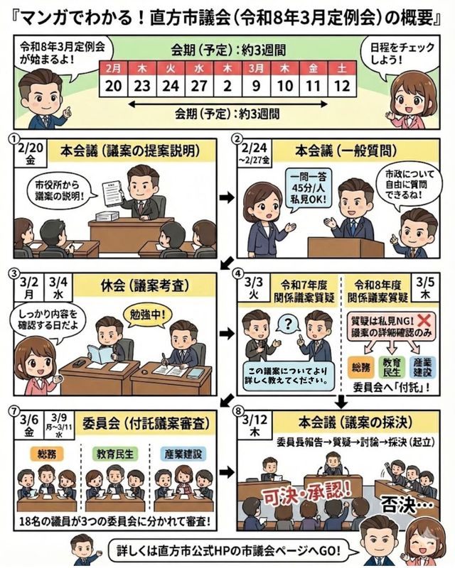 直方市公式HP内の直方市議会のページに令和8年3月定例会の会期日程(予定)が掲載されており、会期は、2/20(金)より3/12(木)の約3週間が予定されています。