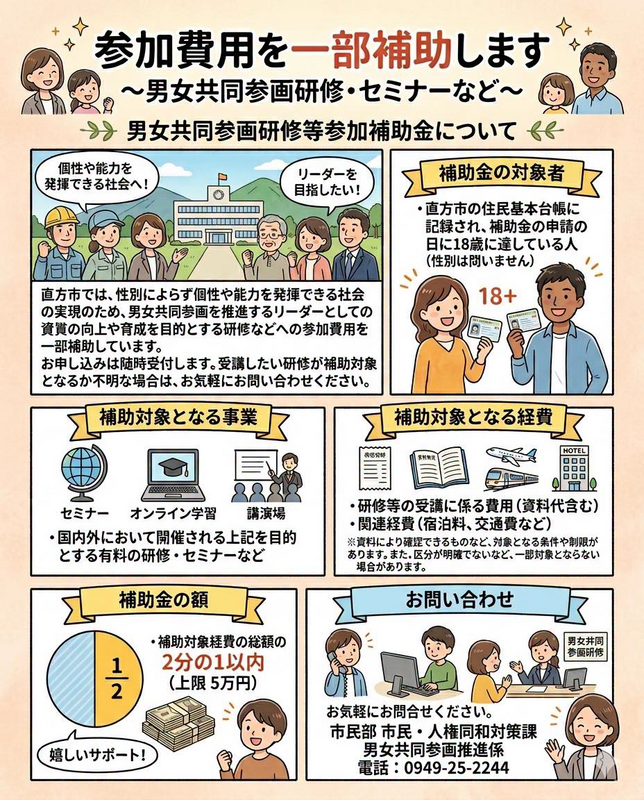 直方市では、性別によらず個性や能力を発揮できる社会の実現のため、男女共同参画を推進するリーダーとしての資質の向上や育成を目的とする研修などへの参加費用を一部補助しています。
